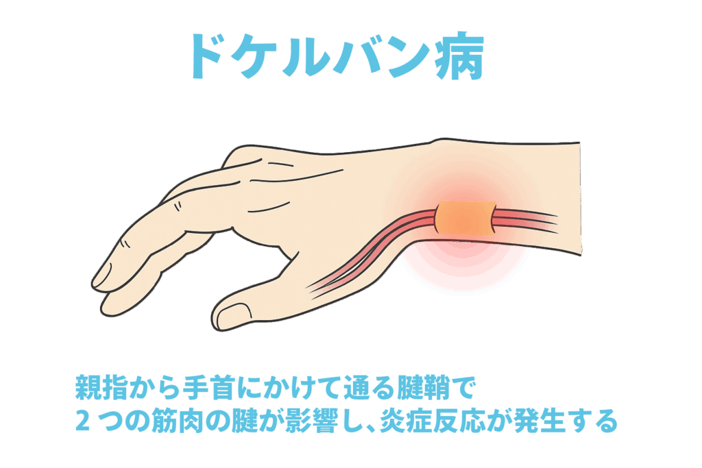 親指側の手首に痛みが出るのが特徴です。親指を握って手首を小指側に倒すと強い痛みが出る(フィンケルシュタインテスト陽性)ことがあります。