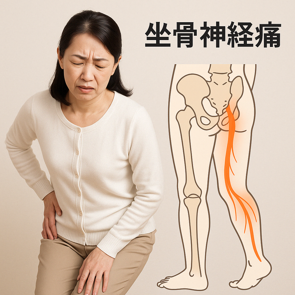 坐骨神経痛とは、腰から足先にかけて走る「坐骨神経」が圧迫・刺激されることで起こる、痛みやしびれの総称です。疾患名ではなく症状名であり、原因となる病気や状態はさまざまです。